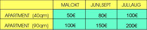 In der folgenden Tabelle finden Sie die Preise für eine Nacht in EURO. Die Appartments werden in der Regel wöchentlich vermietet.